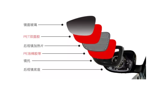 For the assembly and bonding of car mirrors, the tape provided by Fuyin can make the parts lighter and more securely fixed. Fuyin double-sided tape is suitable for different stages of car mirror assembly. When assembling non-heated mirrors, PE foam tape can be used to directly fix the mirror glass on the tray, which has the effect of shatter-proof protection. For heating mirrors, you can use PET double-sided tape to securely fix the heating sheet on the mirror glass on one side, and use PE foam tape to fix the glass on the tray on the other side, with high adhesion and good die-cutting.