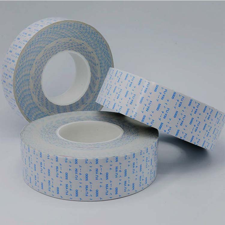Fuyin tissue double side tape is a product basing on tissue, double side coated with high property pressure sensitive glue, compound single silicon or double silicon release material. Have good bounce-proof, warping, hot resistance, high temp resistance property. Stronger adhesion and holding power, have excellent adhesion to many substrate. Easy to peel, clean use. To uneven surface and dirty surface, have excellent adhesion of chemical fiber and wood cotton cloth.