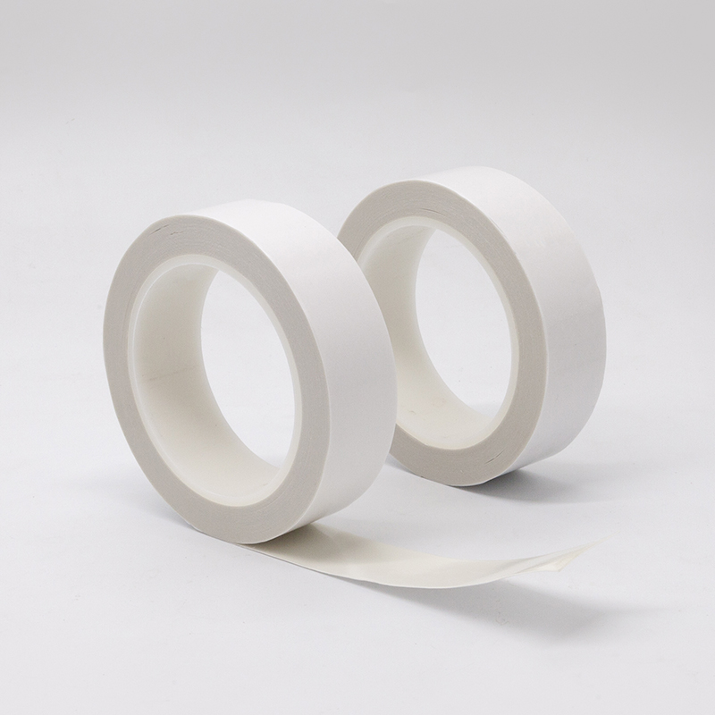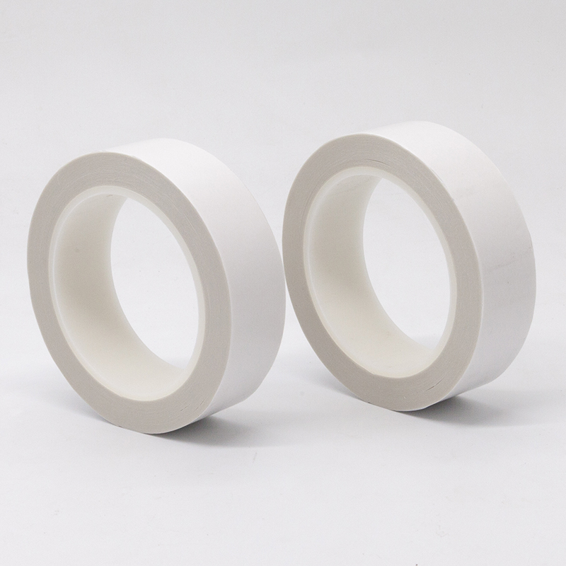 It is a white substrate-free tape made by directly laminating PET release film on both sides of the rubber material.